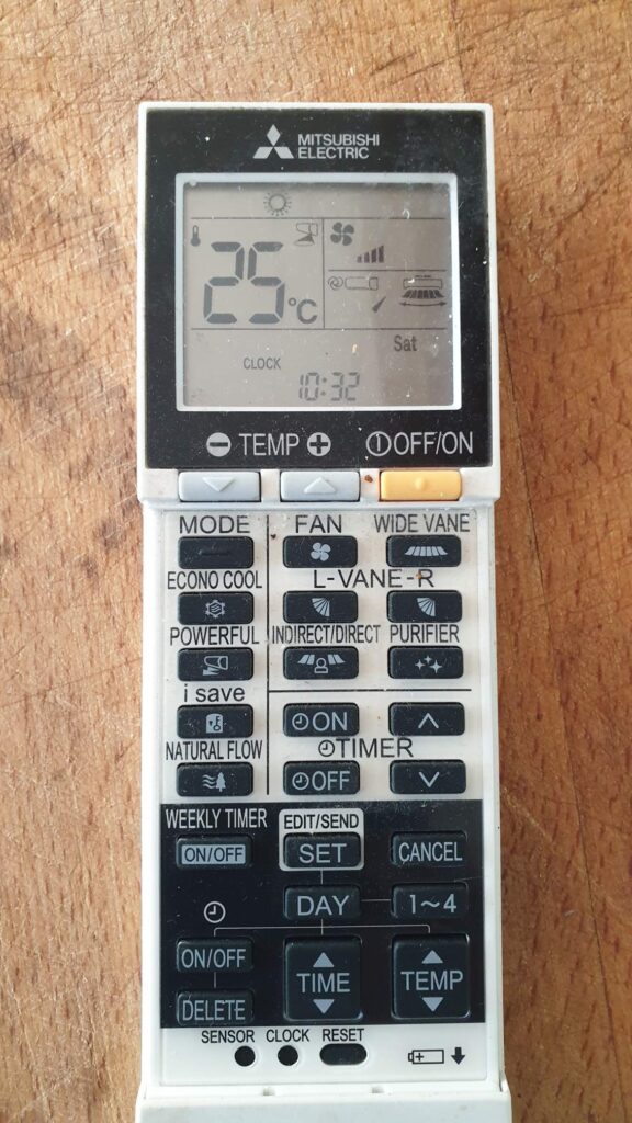 Luftvärmeväxlaren (den vita apparaten uppe på väggen i vardagsrummet) har förvirrande många inställningsmöjligheter. Vi rekommenderar inställningen till höger, som erhålls genom att man trycker MODE tills det ser ut som på skärmen. Den reagerar väldigt långsamt och det kan ta minuter efter inställningen innan varm skön luft börjar blåsa ut över huset.